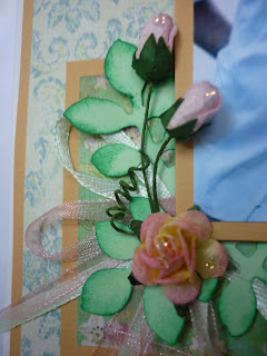 Это первая свадебная страница, она выполнена в более светлой гамме, для украшения страницы использованы цветы, листья,отштампованные и покрытые блестками узоры. Первые буквы имен и дата свадьбы вышиты.